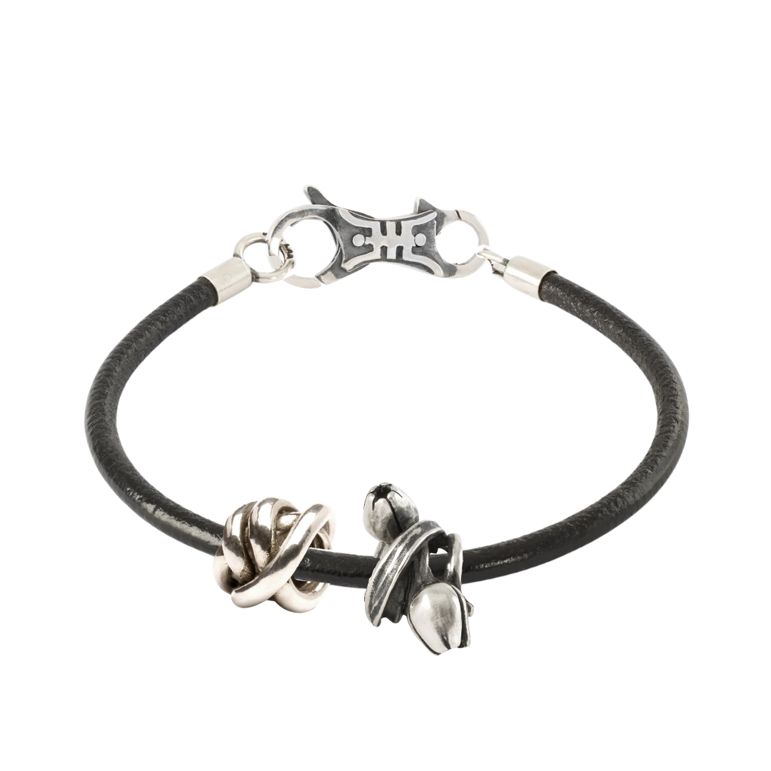 Para el caballero cuyo corazón late al ritmo de la aventura y la actitud. Este set en la pulsera de cuero negro es la brújula del hombre que cree en su destino: Nudo de la Suerte en plata, que anuda las riendas del destino a su favor; Tulipán del Optimismo en plata, que simboliza la esperanza y la confianza en lo por venir; y el broche Longevidad, que cierra este conjunto con la promesa de una vida plena y sin límites. Una pulsera para quien sabe que la suerte sonríe a los valientes.